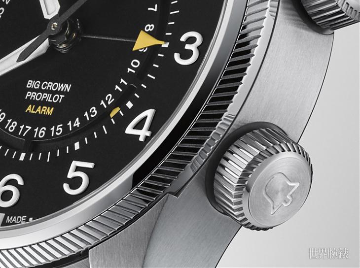 Big Crown ProPilot鬧鈴錶具有兩枚超大尺寸的不鏽鋼錶冠,一個用來設置時間(2~3點之間),另一個用於設置鬧鈴功能(3~4點之間)。兩枚錶冠都是旋入式設計以確保防水性能可以達到100米。