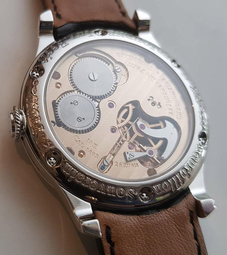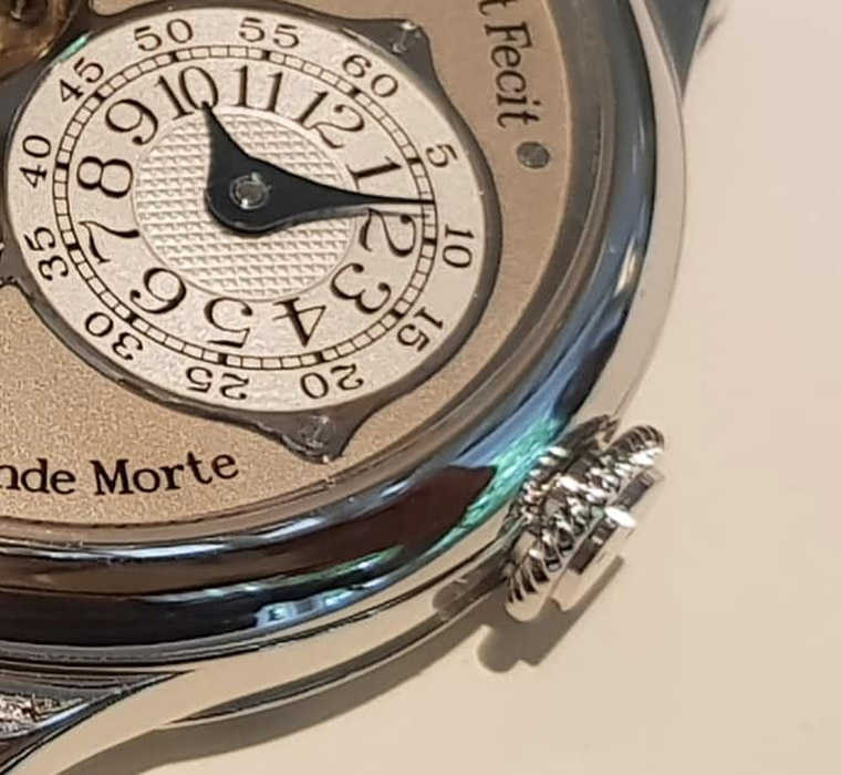 他的作品每一個部份都擁有最高標準的手工拋磨,尤其是擒縱結構的部份,有高級的砝碼微調,雙層游絲與活動式游絲固定裝置等,皆屬於最高規格的製錶技藝。銀質小錶盤位於K金面盤上,獨特造型的燒製藍鋼指針,優雅的扭索刻紋錶冠,每一個細節都以手工完成,這就是玩家所追逐的質感與設計,讓製錶令人感動,有內涵,有熱情,與深厚的製錶底蘊。