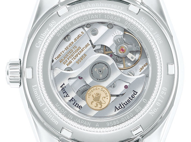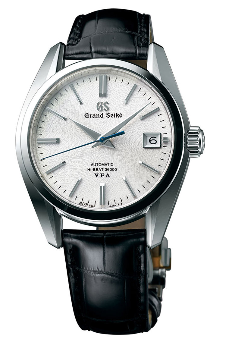 2018年的新作特別調校款V.F.A.紀念腕錶自豪地搭載了9S85機芯,它的9S85 Hi-Beat 36000機芯具有-1~+3秒日差的卓越精準度,是最高階調校與長達34天測試的結果。這款腕錶採鉑金950材質打造,錶殼由1998年第一款9S腕錶的設計師小杉修弘操刀設計,其兩面超鏡面研磨凜冽的延伸至錶耳的最底緣,與髮絲紋交接出完美的三角形線條,體現品牌細膩精良的作工與一絲不苟的職人精神。而此錶款的面盤設計也是特製的,結合了GS為首的字母以及代表1968年第二精工舍(現SEIKO Instruments Inc.,即SII)開發的第一款GRAND SEIKO Hi-beat腕錶上的閃電標誌;這個長期為人們所記憶的標誌,在”GS”為首的字母從面盤中心交織成幾何排列的紋路上脫穎展現。