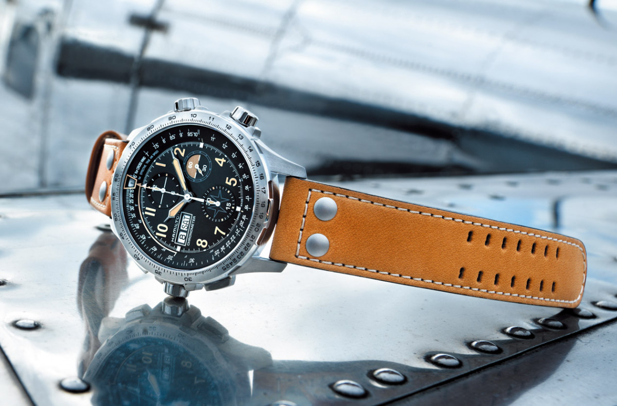 除了機芯大幅升級,更將機艙水平儀、時速表、轉速表等飛行元素融入面盤設計當中,搭配首次採用的二戰風格沙漠式樣夜光指針與時標,在霧面黑色面盤的襯托下,展現漢米爾頓懷舊復古的浪漫情懷。