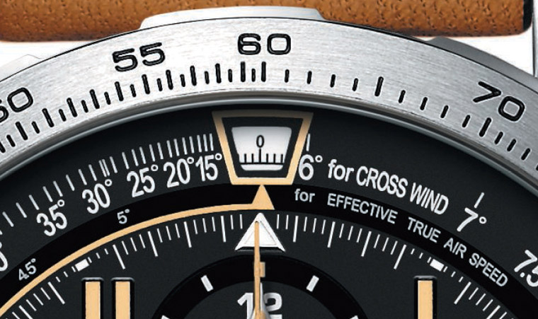 ▲多種飛行元素被細膩融入腕錶的外型設計中,面盤最外圈的偏航角計算器更是透露其飛行錶淵源,增添復古氛圍。