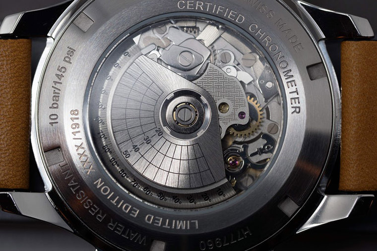 ▲透明底蓋露出H-21-Si機芯可以一窺矽游絲蘊含的高科技製錶精神,此外自動盤上也同樣可見能輔助飛行任務的相關刻度。圖片來源:hodinkee.com