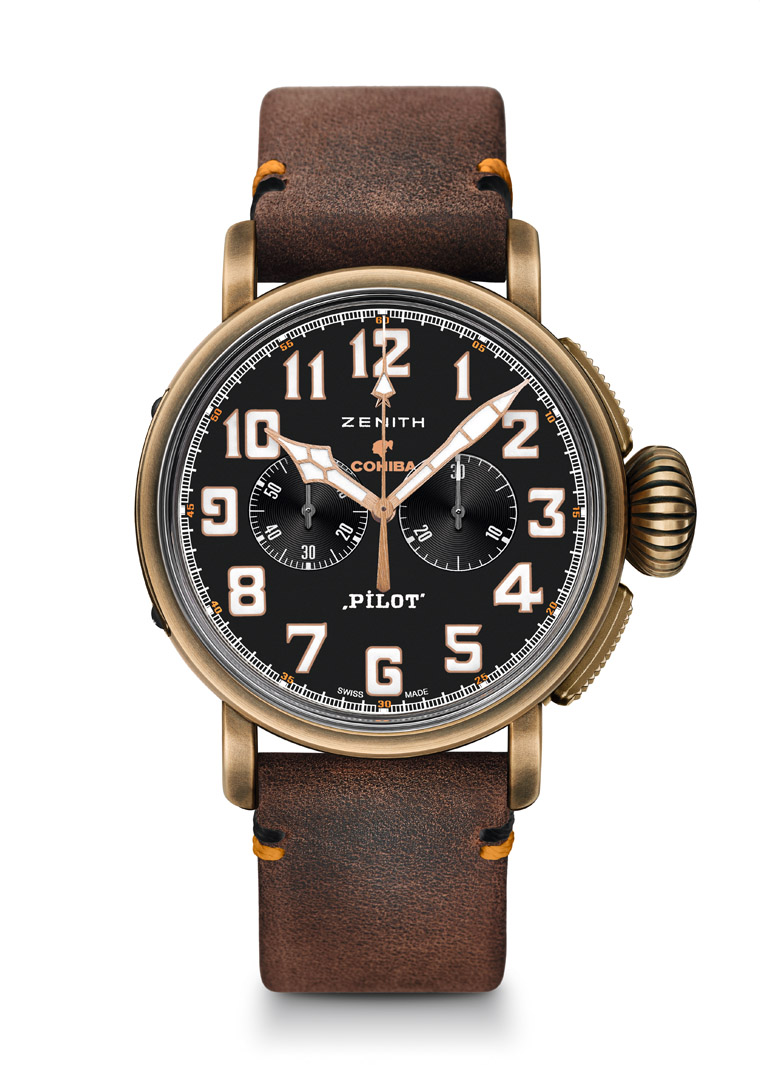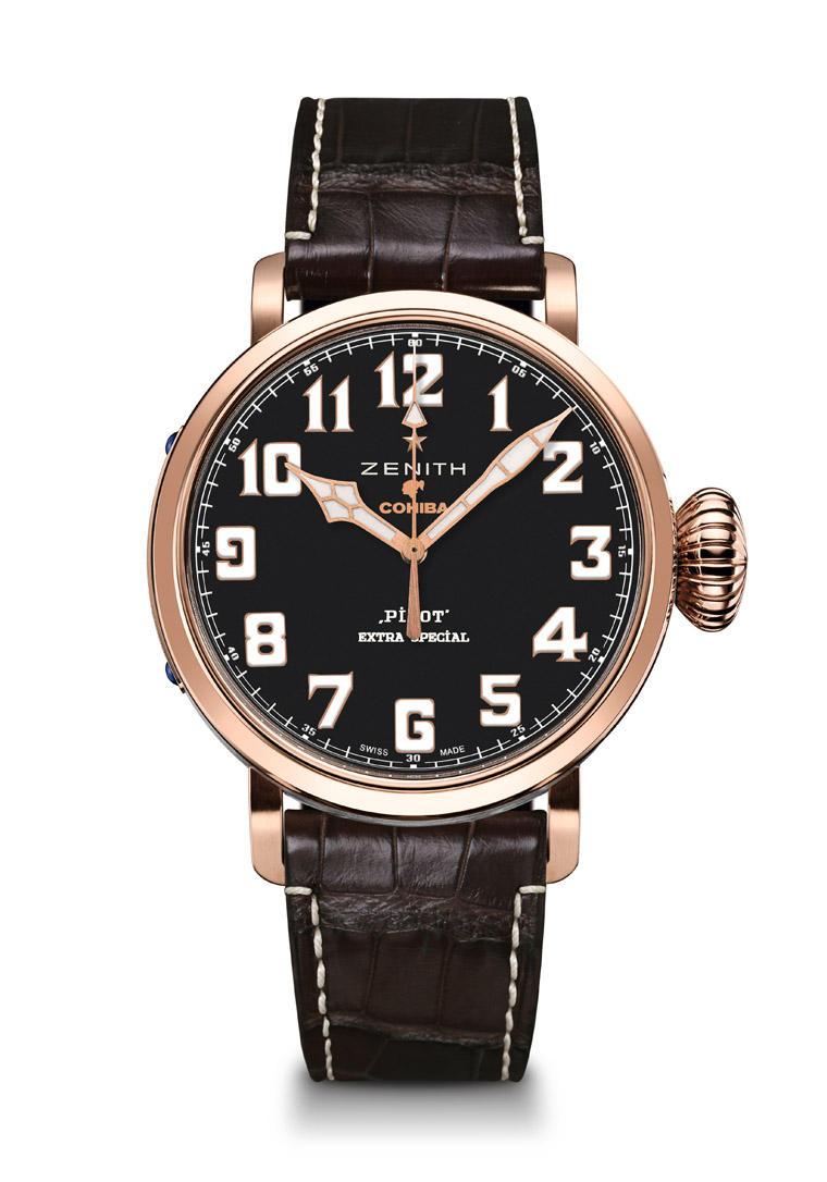 Pilot Type 20 Cohiba Maduro 5 Edition玫瑰金大三針錶款限量發售50只,採用青銅材質的Pilot Type 20 Chronograph Cohiba Maduro 5 Edition計時錶款則為限量150只,這些精美的計時器在其黑色磨砂面盤上展示了真力時和COHIBA的品牌標誌。兩個款式均配有鍍金時針和分針,Pilot Type 20 Chronograph Cohiba Maduro 5 Edition計時錶款並配有一枚位於9點鐘位置的小秒針,並配有中央計時指針和3點鐘處的30分鐘計時盤。與眾不同的鈦金屬錶殼底蓋上鐫刻著限量編號、尊貴的”COHIBA Maduro 5”名稱以及COHIBA的El Laguito古老工廠圖案。Pilot Type 20 Chronograph Cohiba Maduro 5 Edition計時錶款上的棕色油性磨砂皮錶帶,配備橡膠保護襯裡,特殊縫線和鈦金屬針扣;Pilot Type 20 Extra Special Cohiba Maduro 5 Edition玫瑰金大三針錶款則搭配棕色鱷魚皮錶帶、橡膠保護襯裡和18K玫瑰金針扣,為這兩個收藏級品牌錦上添花。