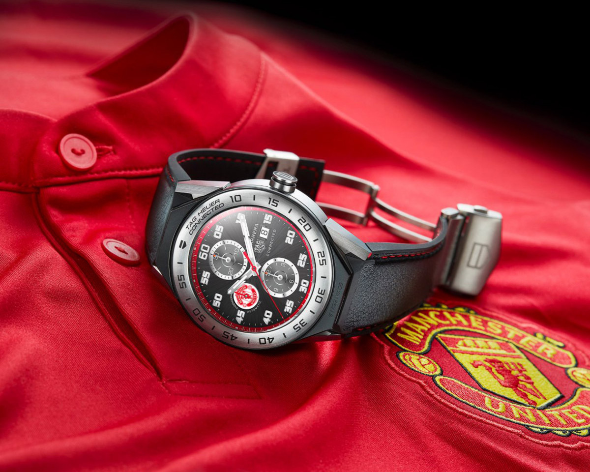▲泰格豪雅為官方合作夥伴曼聯推出了特別版的Connected Modular 45智能腕錶,除了以象徵曼聯的紅色點綴腕錶錶帶等細節,品牌也打造了曼聯面盤背景可供選擇。