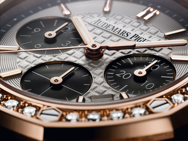 皇家橡樹離岸型自動上鍊計時女錶約在2016年才剛經歷一次讓人有感的改款,在此之前,上一代的外觀設計曾沿用了一段不算短的時間。舊版的錶冠護肩做得比較低、造型切面也相對單調,同時面盤上的大型格紋Grande Tapisserie和阿拉伯數字時標看起來都像是男錶的「縮小版」,問題來了,由於ROO計時男錶的標準尺寸是42mm,至於女錶則是下修到37mm,因此面盤的可用空間顯得更小,這使得阿拉伯數字時標有一部分被小錶盤完全覆蓋,另一部分則是被裁切到,整體看起來相當飽和;新版在尺寸不變的前提下,選擇更有效率地使用有限的面盤空間,一些比較具體的改變例如用矩形時標取代阿拉伯數字時標、12點方向的品牌Logo精簡成一行”AUDEMARS PIGUET”字樣,甚至還有餘裕在三眼錶盤外圍加上邊框,腕錶調整後變得更俐落也更細膩,少了些男子氣概卻也更能襯托女性的柔美氣質。