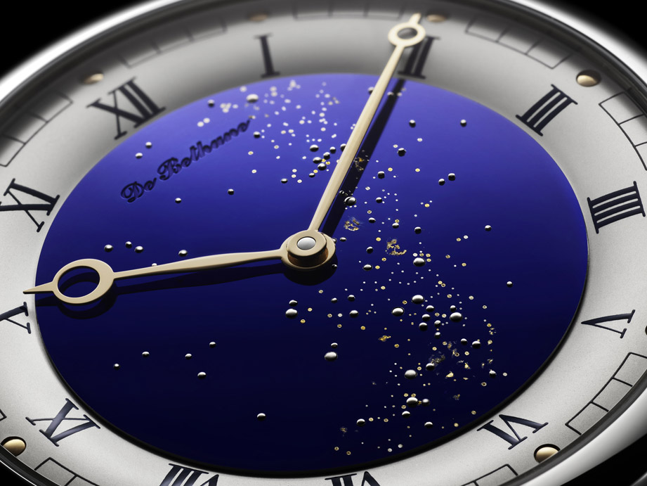 再來看到的是DB25 Starry Varius,說到DB25立刻會想到品牌之前在這款所配置的球體月相顯示,後來也曾推出星空圖面盤款式,說它是DE BETHUNE旗下最富有法國人浪漫基因的錶作應該不會有太多人反對。2018年這款DB25 Starry Varius依舊主打星空面盤,但比起先前幾款”Starry”腕錶,新款的設計相對比較內斂,例如它的星空圖案範圍只集中在面盤內圈(外圍則是一般的銀質刻度時標環),同時指針造型不再採用全鏤空處理,而是修得更修長、更古典,另外先前幾款星空錶往往會搭配球體月相連袂出擊,這次的DB25 Starry Varius也捨棄了月相顯示,乍看似乎規格縮水了,但其實星空盤的作工才是它的主要重點,DE BETHUNE除了在面盤上鑿出大小孔洞、鑲入象徵星體的白金球,還會於其上填入金箔,仿真的層次感讓人看得心曠神怡,最後要提的是這款的星空圖並非固定不變,而是能夠按照錶主的所在地客製化當地星空,這種專屬自己的獨特性,也只有產量少但工藝細緻的獨立錶廠才有可能辦到。