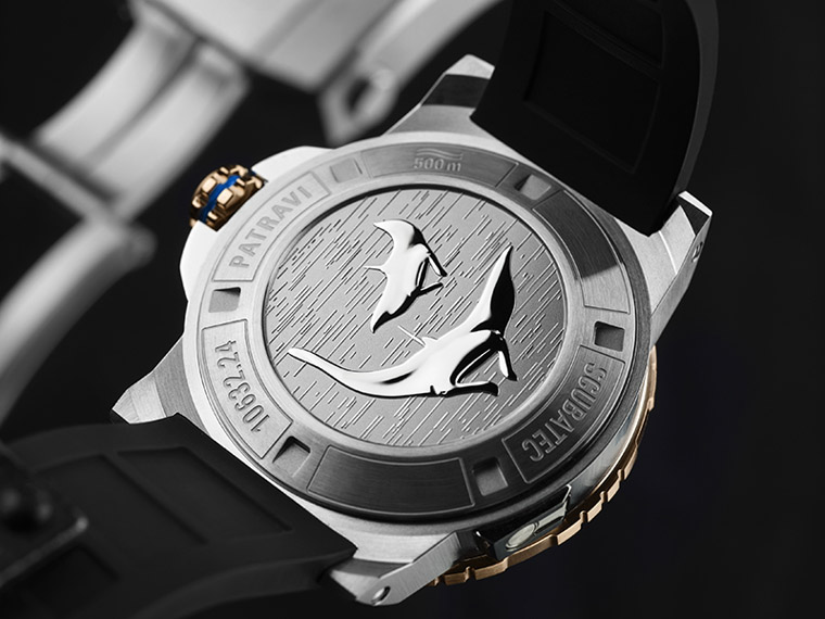 ▲腕錶錶背刻有兩條魔鬼魚圖案,充滿海洋氣息之餘,亦帶出保護海洋生物的訊息。