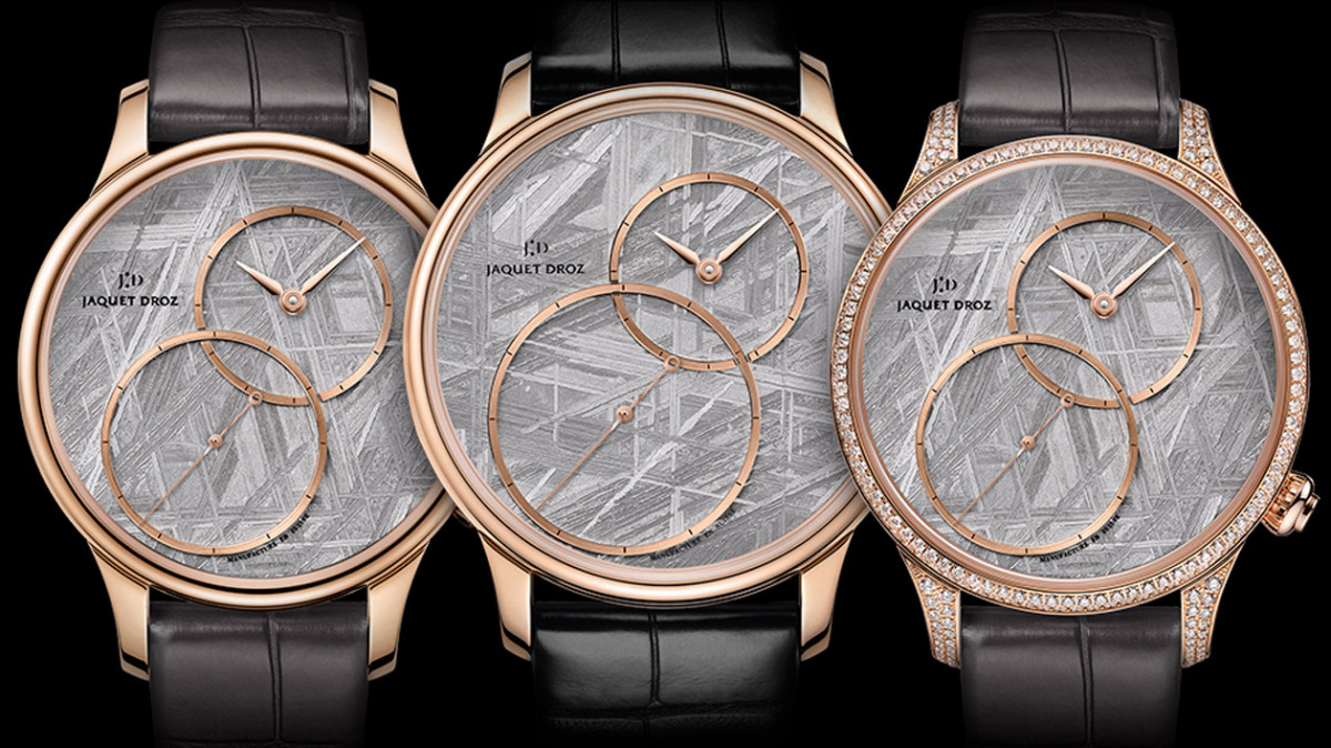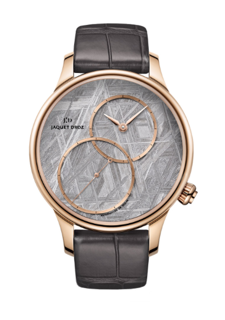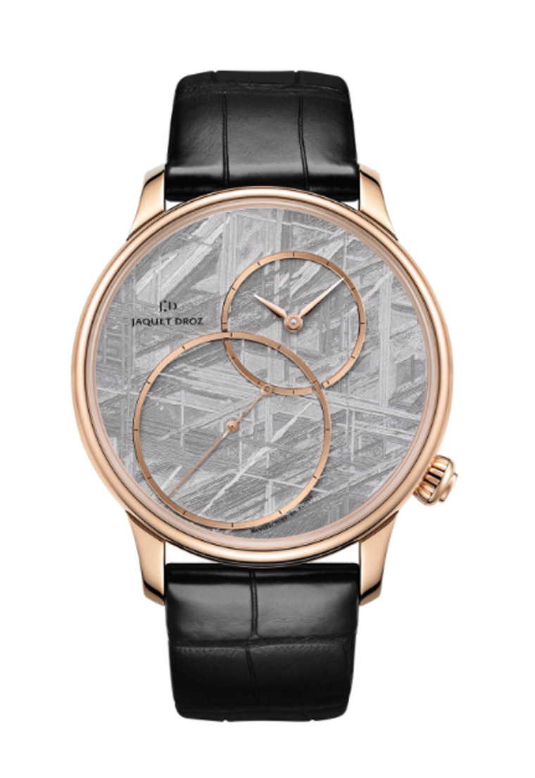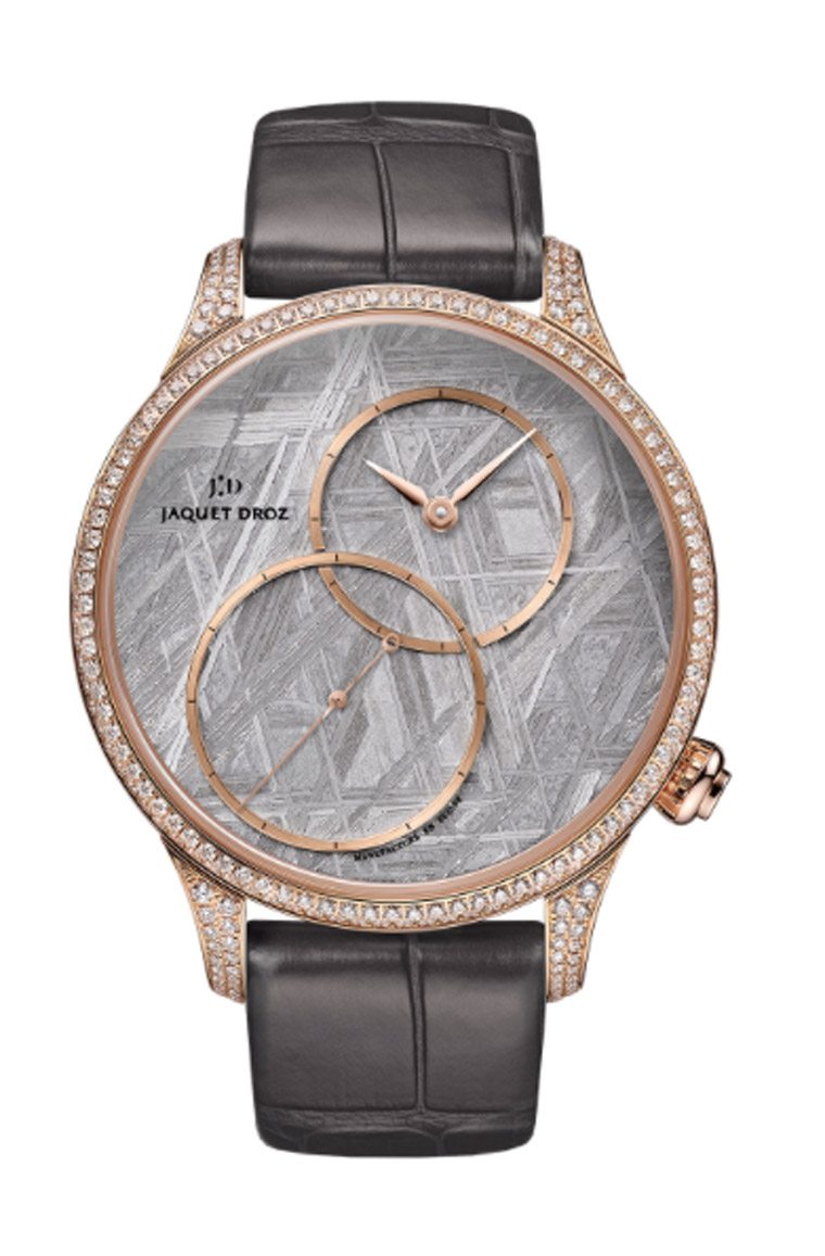 ▲雅克德羅的偏心大秒針系列再添生力軍,品牌特別選用隕石將其加工放入腕錶面盤,以隕石表面自然的幾何磨蝕痕跡作為腕錶面盤的裝飾。