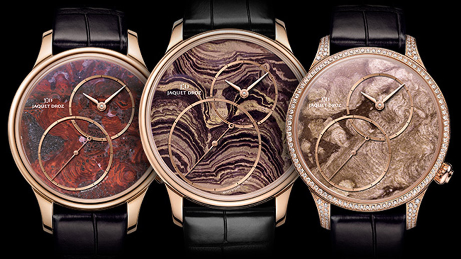 ▲除了隕石素材之外,雅克德羅另外挑選出疊層石打造另款新作,三種不同紋路與色澤的疊層石搭配玫瑰金錶殼,尺寸分別為39毫米、39毫米鑲鑽及43毫米,每款僅限量一只,非常珍貴。