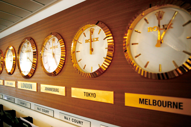 ▲現身穿梭於各地的ROLEX時鐘,每一年溫布頓錦標賽舉辦在世界重要城市,而圖中最下列的標誌顯示其置放位置的資訊。