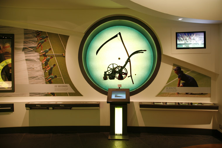 ▲圖中的工具是溫布頓錦標賽所使用的特別除草機;而其左的"22 SECONDS"象徵下雨時以22秒的時間迅速拉起遮雨布的過程。
