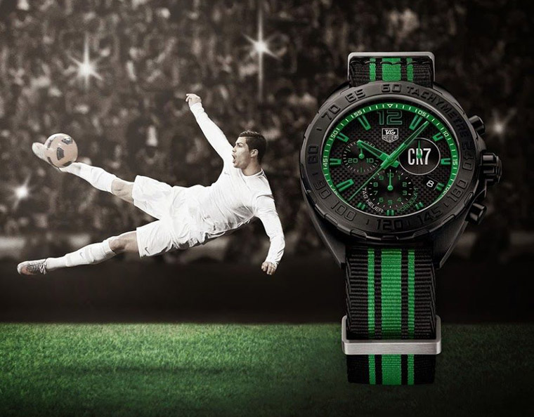 至於C羅近年最讓人印象深刻的手錶代言則是和TAG HEUER在2014~2017之間的合作關係,例如他在2015年國際足聯金球獎頒獎典禮上就佩戴泰格豪雅Carrera Heuer-02T腕錶出席,品牌也曾推出一款Formula 1系列的CR7 Chronometers,黑綠的配色讓人一眼難忘,加上三點位置小錶盤上的”CR7”標誌,更是一看就知道這是屬於C羅的御用款式,後來TAG HEUER也在自家的智慧錶上推出過C羅的特製桌面,可以說是運動錶大牌和運動明星互相烘托的一個成功案例。