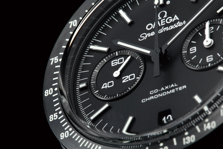 2015年的四款暗面包括了全黑的Black Black、加入OMEGA獨家配方玫瑰金的Sedna Black、導入復古風格的Vintage Black、以及這款強化夜光元素的Pitch Black。四種款式各擅勝場,每款都有打中一個玩家偏好的點,Pitch Black跟原本的月之暗面差別算是最小的,它同樣採用了消光的黑色陶瓷錶殼、錶圈和底蓋,不同的地方在於除了指針和時標之外它錶圈上的測速刻度也會發亮,這次的四款暗面中只有它和Vintage Black有這個細節。