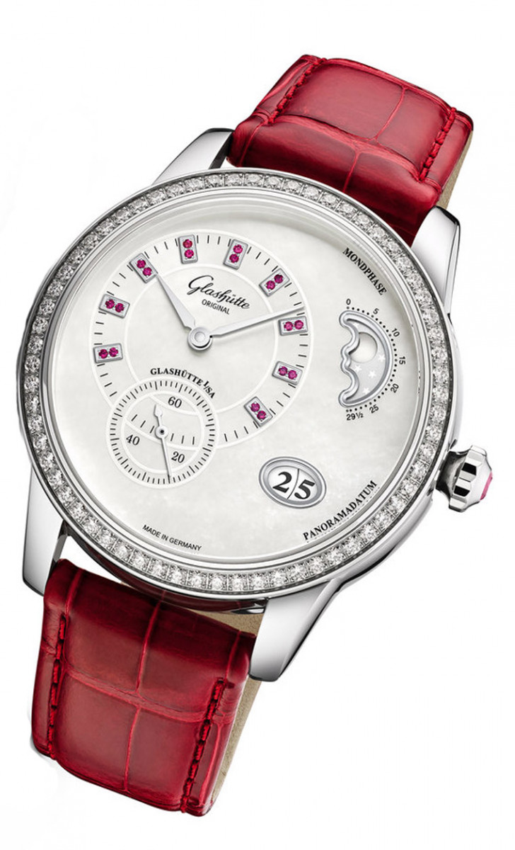 全新PanoMatic Luna偏心月相女士腕錶的錶圈鑲嵌64顆明亮型切割鑽石(共0.95克拉),璀璨光芒,無可阻擋。在被這64顆鑽石環繞的39.4毫米圓形不鏽鋼錶殼的右側設有錶冠,以一顆紅寶石作為裝飾,與腕錶整體配色和諧統一。藍寶石水晶玻璃錶鏡,雙面防眩處理,為面盤營造清晰視野。亮紅色路易斯安那鱷魚皮錶帶,配以精緻針扣,安全、時尚,穩穩鎖住腕間風采。