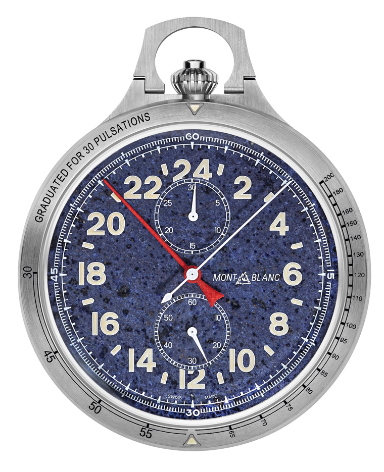 直徑60mm的懷錶使用等級二之鈦金打造,採拋光處理,並飾以緞面紋飾。本款懷錶搭載萬寶龍自製手工單按把計時機芯MB M16.24,具有經典的V形計時錶橋與Minerva錶廠特有的箭頭標誌,這些設計元素之靈感係源於Minerva錶廠的單按把計時機芯MB M16.29,獨特的中央紅色指針塗覆SuperLumiNova®超螢光塗層,用來顯示軌道式分鐘刻度環上的24小時刻度。面盤採用天然礦石藍線石,散發獨特的藍色外觀,並蘊含所有萬寶龍1858系列的特有設計細節,包括:塗覆SuperLumiNova®超螢光塗層之米色阿拉伯數字、時標與指針、復古的凹槽紋錶冠、單按把計時功能、與昔日的萬寶龍標誌。