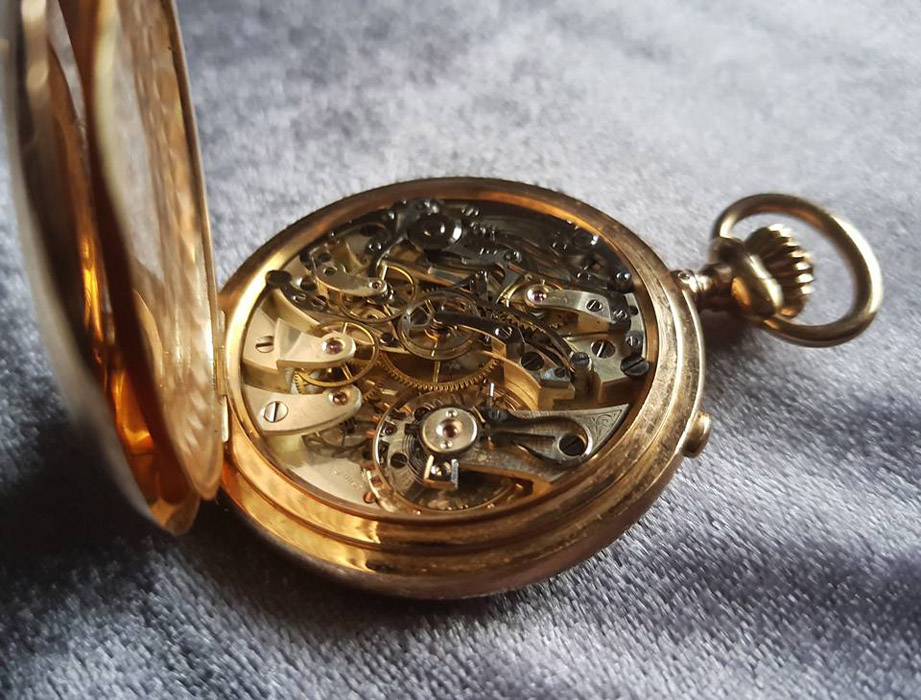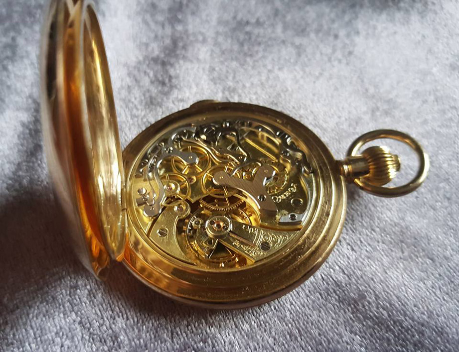 ▲LONGINES三問加計時功能懷錶,18K金,1930年。