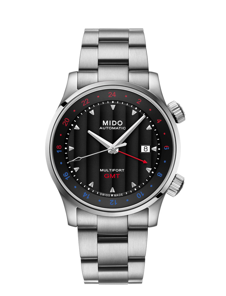 Multifort GMT先鋒系列兩地時區腕錶配備第二時區功能,由紅色亮漆塗層的箭形指針指示,以獨一無二的設計精隨和豪邁剛健的氣質,一手掌握全球時刻脈動。日內瓦波紋裝飾面盤呼應雪梨港灣大橋垂直的金屬結構之美,象徵上世紀三○年代初期的現代建築風格。可旋轉的24時區上半部顯示更巧妙地以將數字以紅色亮漆塗層點綴呼應第二時區的指針,賦予錶款動感的設計細節。不鏽鋼鍊帶款搭配質感黑色面盤,以洗鍊的黑色基調譜寫摩登狂想;PVD玫瑰金處理錶殼與深邃的藍色面盤,更顯相得益彰的撞色魅力,動感美學新作展現MIDO對精準度的要求。