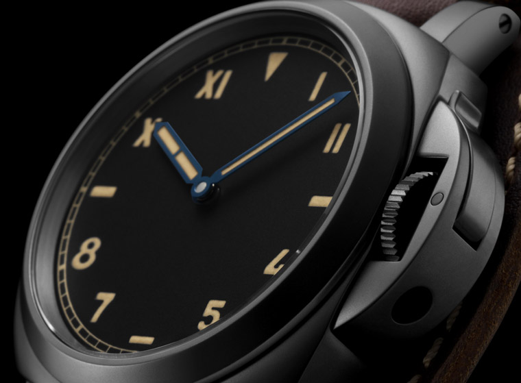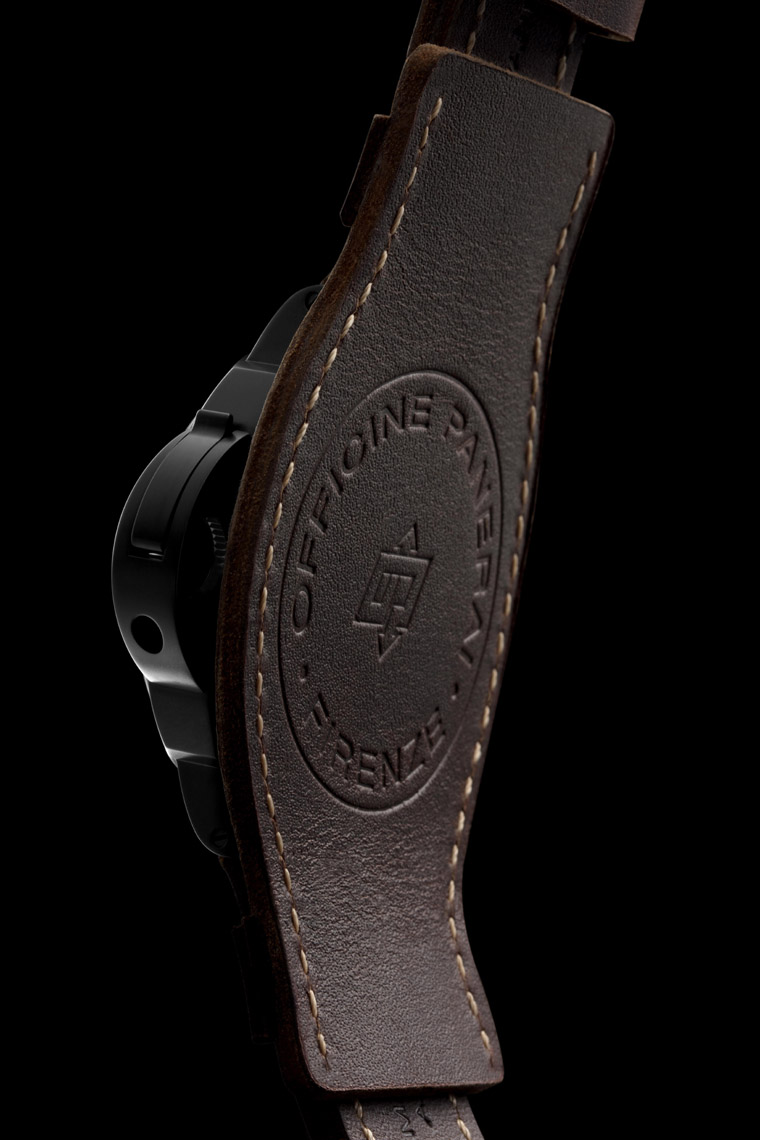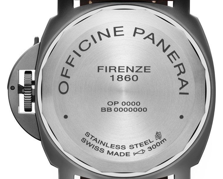 腕錶選用以鈦金屬鑄造的Luminor錶殼(直徑44毫米),經DLC類鑽碳鍍模加工,碳基鍍模令鈦金屬錶殼呈現平滑均勻的霧面碳灰色,同時提升錶殼硬度,防止磨損及侵蝕。保護錶冠的護橋槓桿亦鍍上DLC類鑽碳硬模,令腕錶配備高達300米)的防水性能。