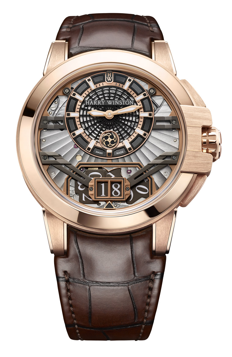 海洋Ocean系列Big Date大日期42毫米自動腕錶大膽不羈、極富建築感的面盤構造讓人聯想起紐約高聳入雲的摩天大樓內部之鋼鐵框架、鋼樑、橫樑和螺絲,淋漓展現海洋系列的前衛精神,同時向海瑞溫斯頓品牌誕生地紐約致敬。富有現代感的鏤空面盤採用多層結構設計,營造出令人神迷的立體格局。大型放射狀日內瓦飾紋錶橋向錶盤外圈散射而出,四枚霧面棕色支架將時分盤和大型日期顯示窗固定於錶盤之上。標誌性的忍者鏢圖案位於6點鐘位置的時分盤上,整體設計現代時尚、卓爾不凡,將非凡性能與工藝淋漓展現。
