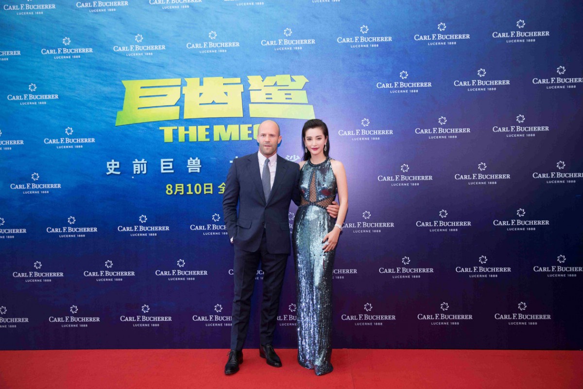 ▲寶齊萊全球形象代言人李冰冰與主角傑森·史塔森出席《巨齒鯊》全球首映會。