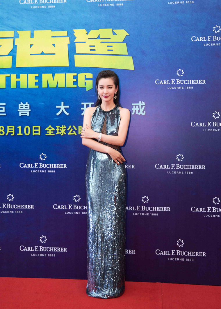 ▲寶齊萊全球形象代言人李冰冰佩戴雅麗嘉天鵝限量珠寶腕錶亮相《巨齒鯊》全球首映會。