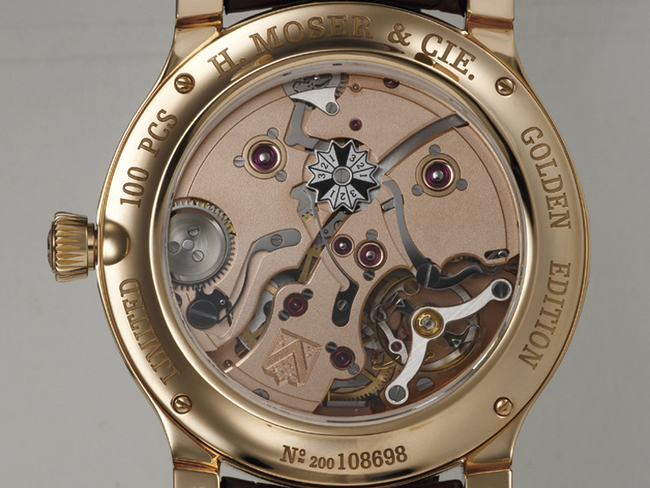 而為了慶祝這小小的5週年紀念日,H. MOSER & CIE特別為收藏家們發表了僅限量100只的「Perpetual Golden Edition系列限量萬年曆黃金手錶」。正如它的品名所想要表達的意義般,「黃金」在該款限量手錶裡佔有重要的地位。熟悉H. MOSER & CIE的鑑賞家們都知道,H. MOSER & CIE僅使用貴金屬材質來打造錶殼,甚至連可更換的擒縱系統模組內的馬仔與擒縱輪,也是採用貴金屬材質所製作的。而在「Perpetual Golden Edition系列限量萬年曆黃金手錶」中,不僅是原本的馬仔與擒縱輪,甚至連「雙游絲擺輪」都是以黃金所打造;而原本以鈹青銅(Glucydur)所製造的擺輪配重螺絲,也改以更高貴的白金材質製成。另外值得一提的是,H. MOSER & CIE所獨家研發的雙游絲擺輪系統(Straumann)具有極為順暢,線性的運轉曲線,雖然製作難度頗高,而也因為這革命性擒縱系統的誕生,讓號稱追求高精準度的陀飛輪裝置,更顯其多餘與過時。