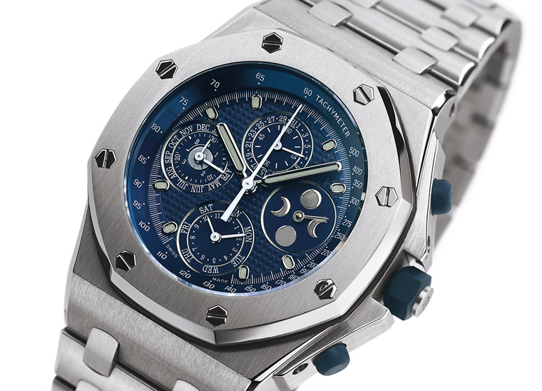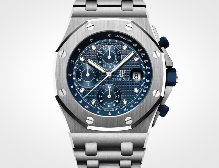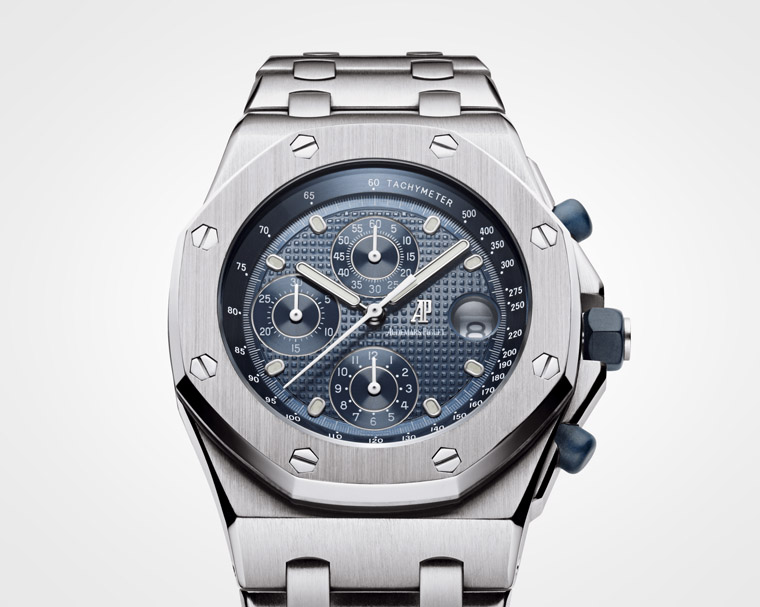 第一只皇家橡樹離岸型腕錶在全球掀起了大尺寸奢華腕錶的流行風潮,奠定了錶殼尺寸的新標準。藍色"Petite Tapisserie"小格紋裝飾面盤具有日期、小秒鐘及計時功能顯示,外圈配以測距儀刻度,採用抗磁錶殼,防水深度達100米,搭載Calibre 2126/2840自動上鍊機芯。