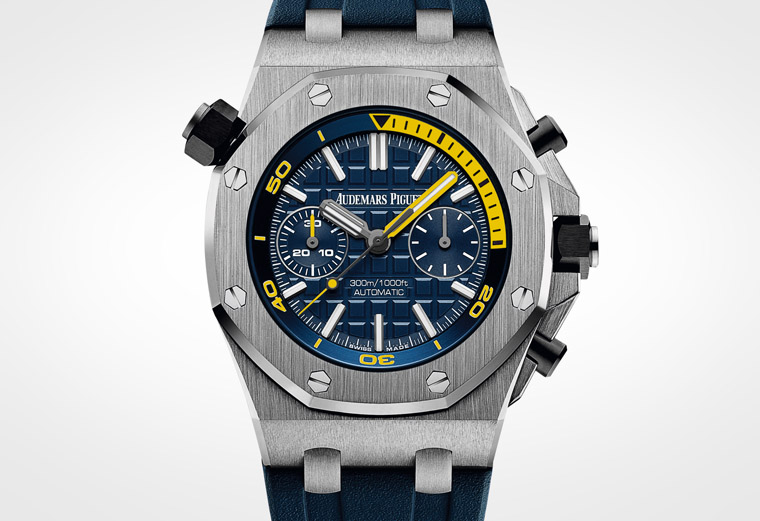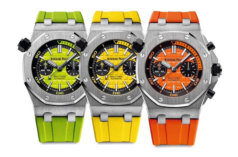 2016年,愛彼推出第一款具有計時功能的皇家橡樹離岸型潛水腕錶,並採用繽紛色彩的面盤與錶帶設計。腕錶配以色彩鮮明的旋轉內錶圈、潛水分鐘刻度、小秒針和30分鐘計時顯示,面盤採用"Bi-compax"水平對稱副錶盤,搭載Calibre 3124/3841自動上鍊自產機芯,動力儲存達到50小時,搭配直徑42mm的不鏽鋼錶殼與防眩光處理藍寶石水晶玻璃底蓋。