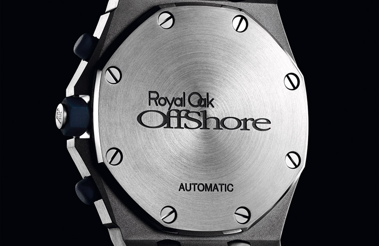▲編號Ref. 26237ST.OO.1000ST.01底盤的中心位置刻有"Royal Oak Offshore"標誌以及"AUTOMATIC"字樣,且藍色橡膠材質包覆著按把及旋入式錶冠,無論是大尺寸的設計或創新材質的使用,都在當時掀起風潮。