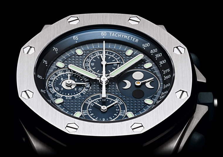 在皇家橡樹離岸型面世的4年後,第一款具有複雜功能——皇家橡樹離岸型萬年曆計時碼錶問世。搭載Calibre 2226/2839自動上鍊機芯,在面盤設計上與首只皇家橡樹離岸型腕錶有著異曲同工之妙:藍色"Petite Tapisserie"小格紋裝飾面盤將計時功能與萬年曆的各項顯示完美結合,3點位置為月相,6點位置為12小時計時與星期顯示,9點位置為30分鐘計時顯示、閏年與月份顯示,12點位置為小秒鐘與日期顯示。