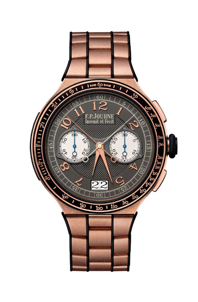 F.P.Journe為lineSport運動系列增設一個新款Chronographe Monopoussoir Rattrapante。這只腕錶配備全新研製的追針計時裝置及大日期顯示,並設有鉑金、18K玫瑰金及5級鈦金屬三款,統統配備直徑44毫米的錶殼,錶殼厚度僅為12毫米;其中鉑金及玫瑰金表款搭載18K玫瑰金機芯,鈦金屬錶款則內置鋁合金機芯。