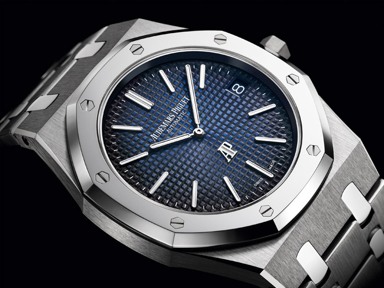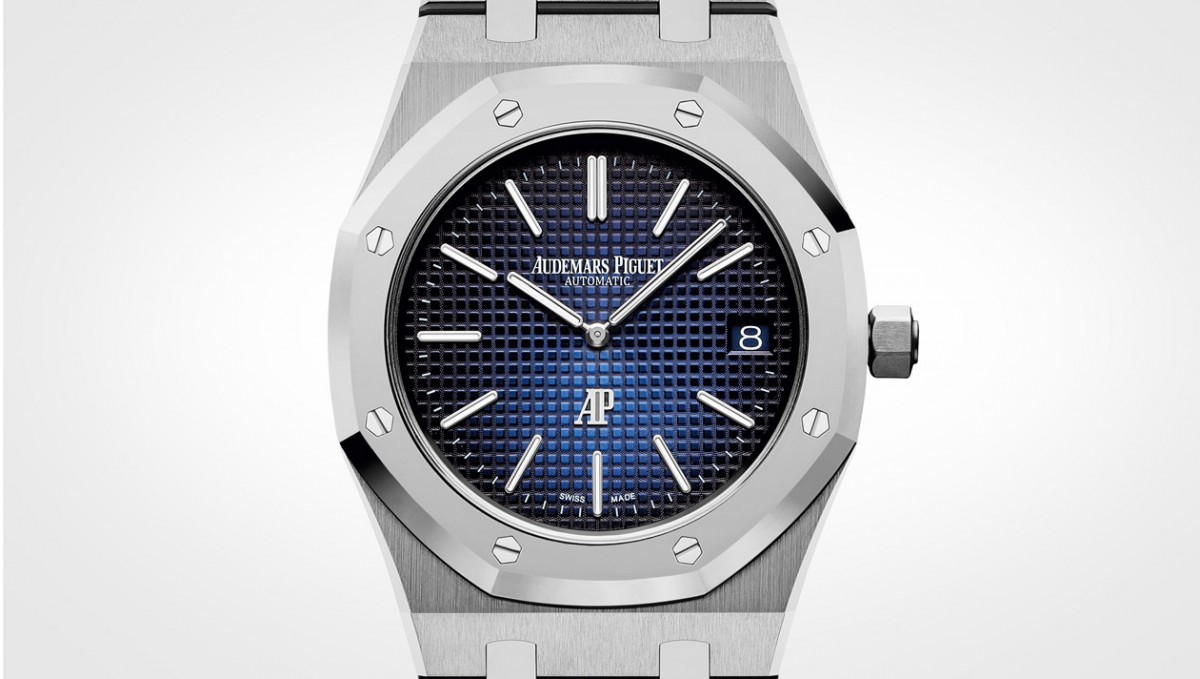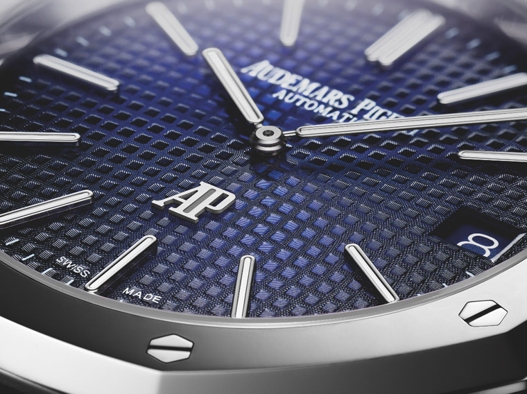 ▲經典的棒狀時分設計,以及六點鐘的AP字樣都採用白金材質,搭配細膩的"Petite Tapisserie"格紋面盤,同時換上了嶄新的漸層藍面,讓人愈看愈對眼。