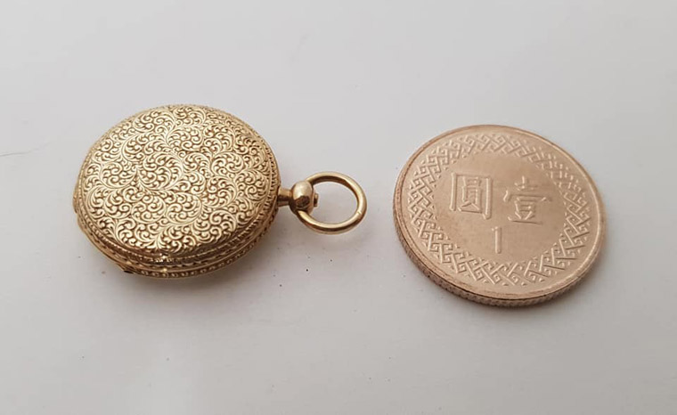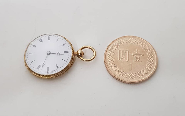 兩大品牌聯名,比台幣一元硬幣更小的金雕懷錶,約1900年由PP製作,非常罕見的小懷錶。