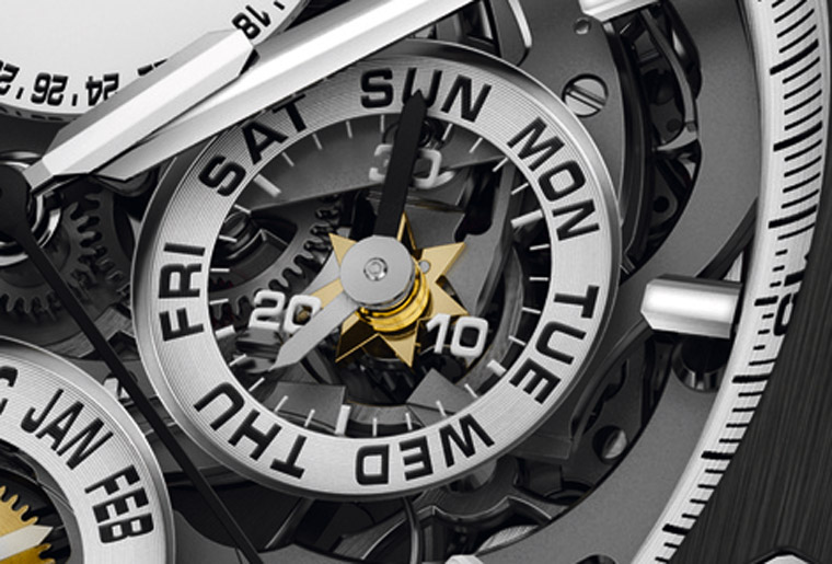 為了有條理地將計時和萬年曆的資訊顯示,兩者指針分別採用銀、黑兩色,而雙追針的兩支指針亦同樣以一銀一黑來作區別。