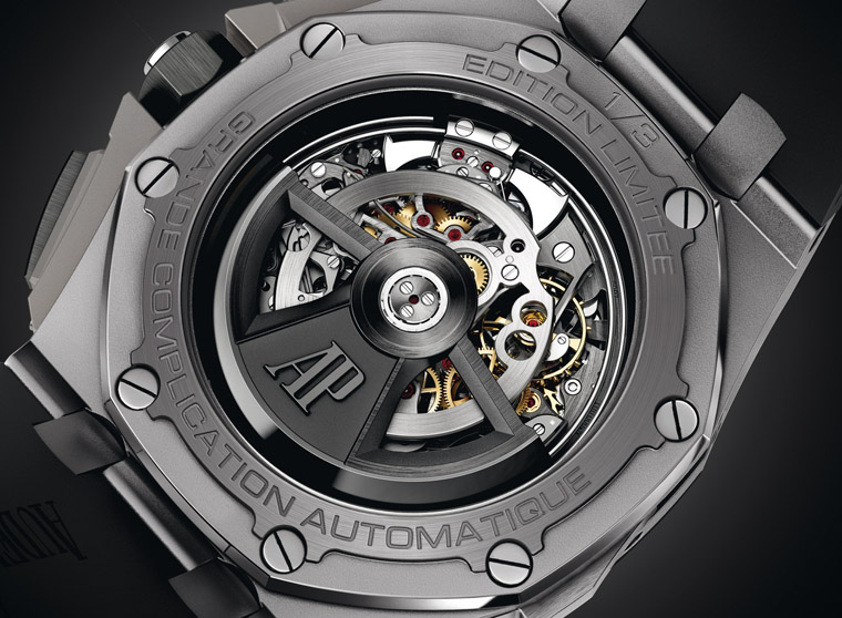 三問、萬年曆、雙追針計時,光是其中一項就已經是腕錶上罕見的複雜功能,愛彼將這樣的3項功能集於一體,其機械零件的繁複可想而之,雖然皇家橡樹離岸型腕錶一向以大錶徑見稱,而這款大複雜腕錶的錶殼亦有44mm之大,但要完美地製做這只腕錶的心臟著實不易,要使這些功能順暢運行,機芯需由648枚零件組裝而成,而機芯內的零件都經過倒角、拉絲等傳統手藝的加工,再透過噴砂處理等現代化表面加工技術突顯其中的獨特美感,而為了配合皇家橡樹離岸型系列強烈的運動型格,原本的金質自動盤亦改以黑色鍍膜處理,將腕錶的帥氣現代風格進行到底!如此講求精緻度的大複雜功能腕錶製作起來自然耗費時間,單是機芯就需要錶廠製錶師投入700個工時,所以這款讓人驚歎的新作僅接受訂製(選擇訂製腕錶的話,自動盤可依個人要求訂做),限量發行3只,保證此一計時傑作的高品質。
