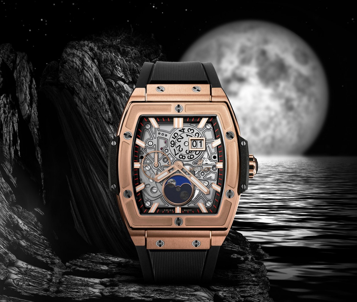 18K皇金材質/HUB1770自動上鍊機芯/時、分、小秒、大日期顯示/月相顯示/藍寶石水晶鏡面、透明底蓋/防水100米/錶徑42mm/參考價:NT$ 1,207,000