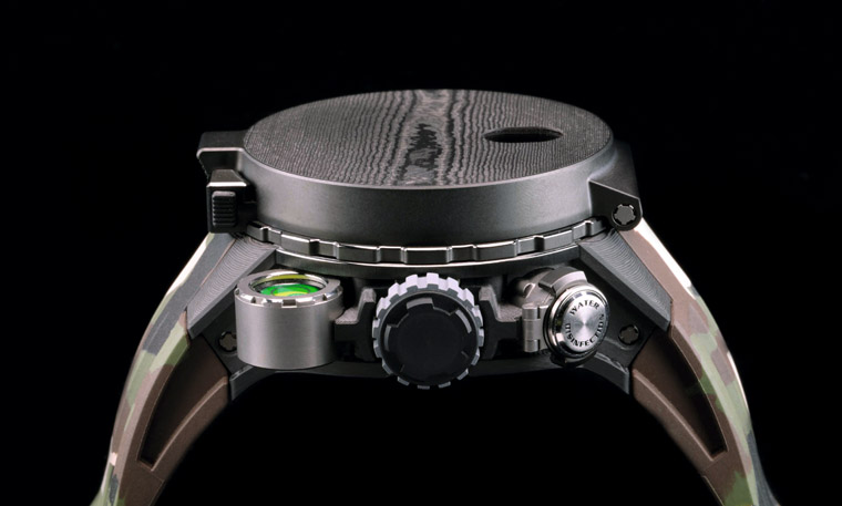 ▲錶冠2時位置配置可存放淨水藥片的鈦合金密封容器,4時位置的水平儀幫助測向更加準確