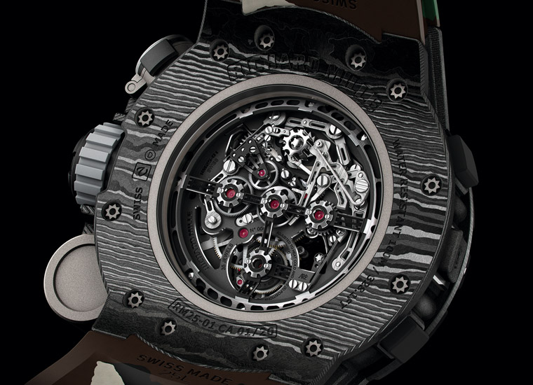 為符合其所體現的冒險精神,錶帶採用印有迷彩圖案的天然橡膠製成,更與眾不同的是,RM 25-01錶冠在2點鐘位置有一個五級鈦合金密封容器,可存放淨水藥片,根據水的污染程度,可在30~120分鐘內使一公升水達到安全飲用級別,非常符合野外求生的需求。