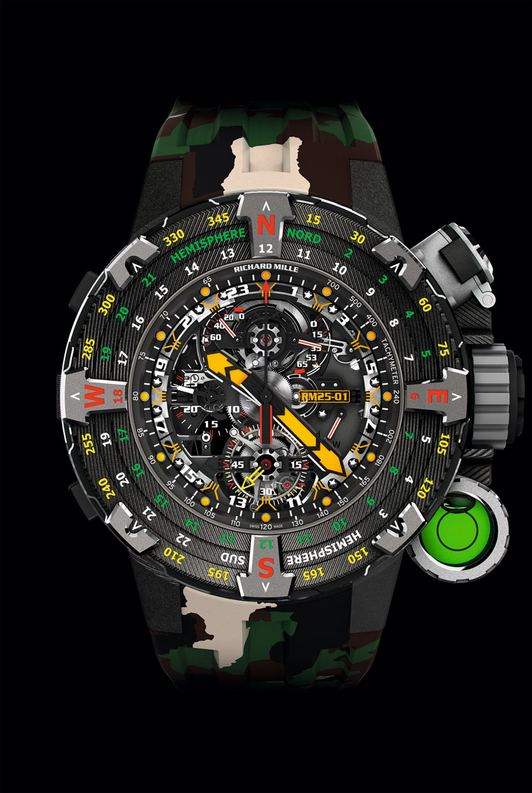 RM 25-01防水深度達100米,配有兩組可替換錶圈。第一組是經DLC塗層處理的5級鈦合金指南針錶圈,配有固定式及可旋轉式錶圈各一個。面盤上配有卡榫,可將其快速方便地固定在錶殼上。TPT®碳纖維錶蓋反面鑲有鏡面,並在12點位置刻有一個凹槽,以提高指南針的瞄準精度。其藍寶石水晶採用多層抗反射處理工藝,並採用防磁塗層,防止機芯和指南針相互干擾。位於4點鐘位置的水平儀可檢查腕錶是否完全水平,使測向更加準確。指南針可從錶上卸下,安裝在一塊TPT®碳纖維材質的板上。該配置提供了諸多實用功能,例如專用於指示方向的刻線,在使用地圖導航時,非常適合用它來定向。第二組是TPT®碳纖維和鈦合金製成的雙向日間錶圈,並配有24小時刻度、360°刻度盤以及基本方向指示。無須進行任何計算,只要將時針面向太陽並轉動錶圈,24小時刻度盤上就會顯示出當地的時間,完全不受南北半球的影響,可以毫不費力地辨別東西南北。
