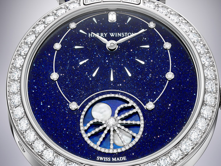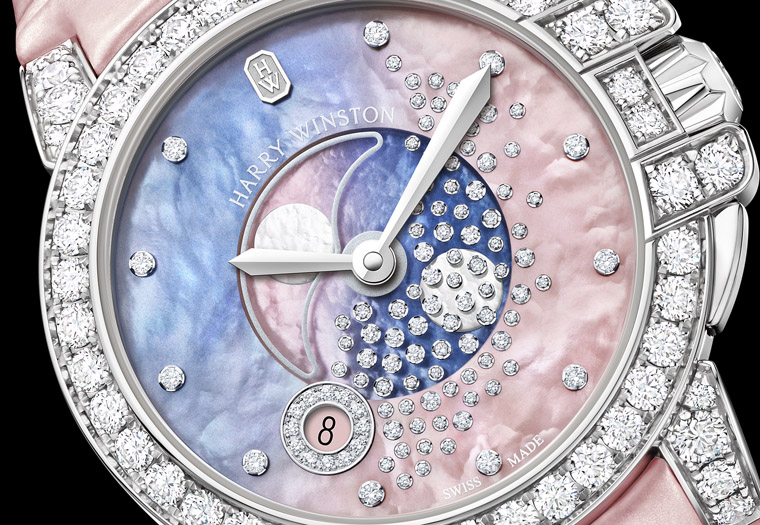 ▲卓時Premier系列Precious 36毫米月相錶設計的創新之處在於海瑞溫斯頓製錶師透過顯示窗,同時展現兩輪月亮的形態,而非一輪月亮,盡顯月相複雜功能的內在美感。