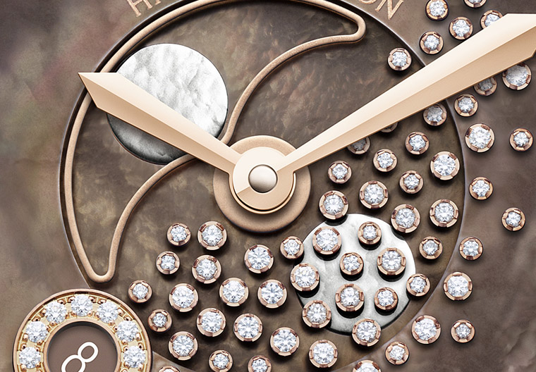 ▲Ocean系列36毫米月相錶精美的多層手繪背景分佈於點綴著鑽石時標的外環及月相顯示盤上。
