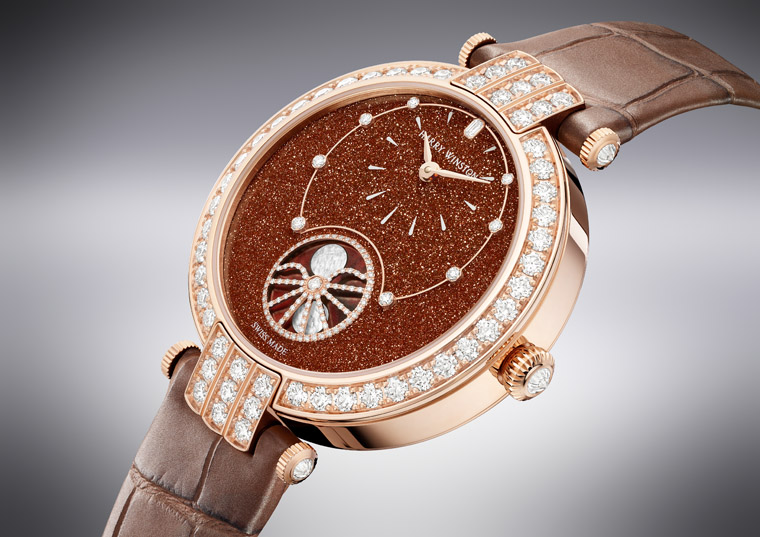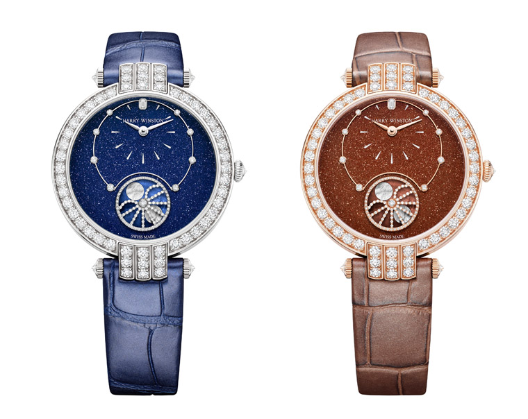 18K玫瑰金或18K白金材質/HW3102自動上鍊機芯/偏心時、偏心分顯示/月相顯示/藍色或哈瓦那棕色砂金石面盤/面盤鑲鑽103顆、錶殼鑲鑽57顆/藍寶石水晶鏡面、透明底蓋/防水30米/錶徑36.2mm