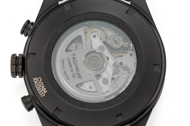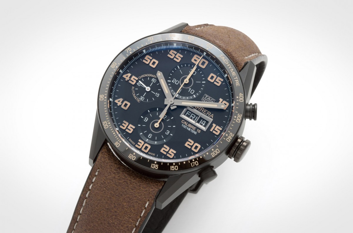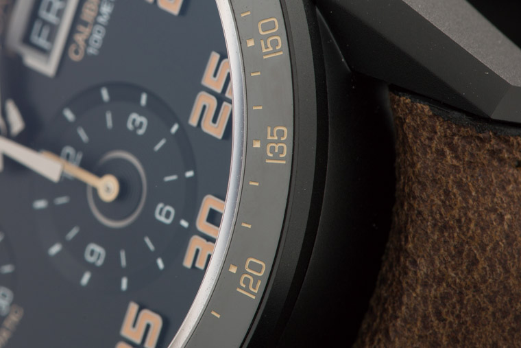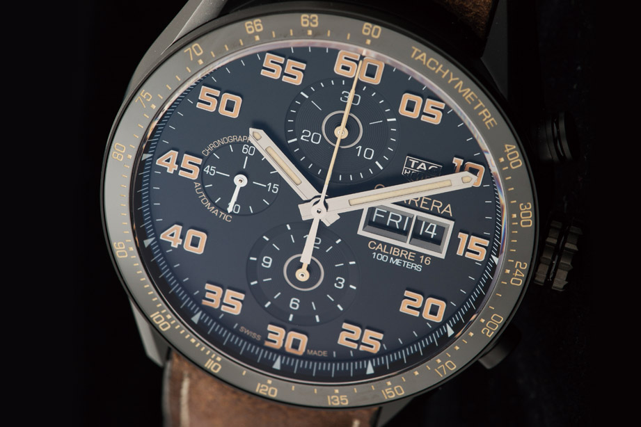 在Heuer 01、Heuer 02系列機芯大行其道的今日,Carrera系列搭載其他機芯的款式近年有稍微被冷落的趨勢,不過2018年趁著Carrera系列五十五週年,TAG HEUER又推出了新款搭載16機芯的復古設計款式,而這款則是在這之前一年推出的黑色PVD鈦金屬版,價位上雖然稍微比今年新款高一些,但是錶款的設計還是有些微的差異,包括多了星期顯示、PVD加工以及錶圈上的刻度填上夜光物料等,其實價差並不大,但是新舊款擁有的規格也都算是符合自己的身價,選擇這款的或許會因為它獨特的五分鐘刻度而好感度提升,加上全黑的帥氣風格,這也會是一個加分的因素。
