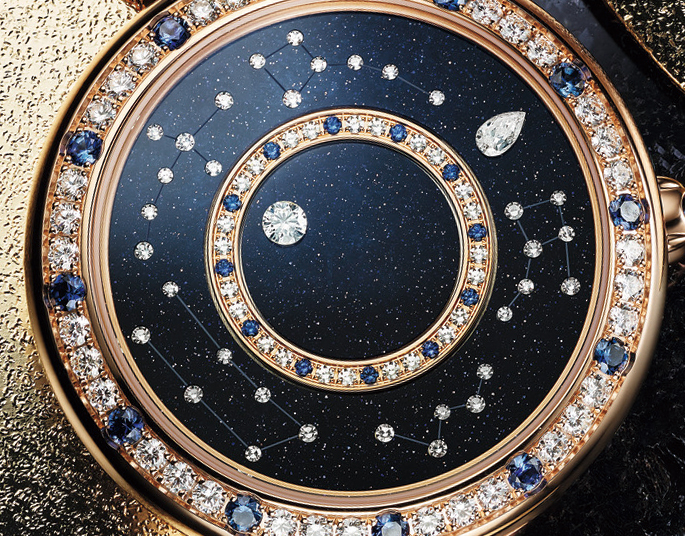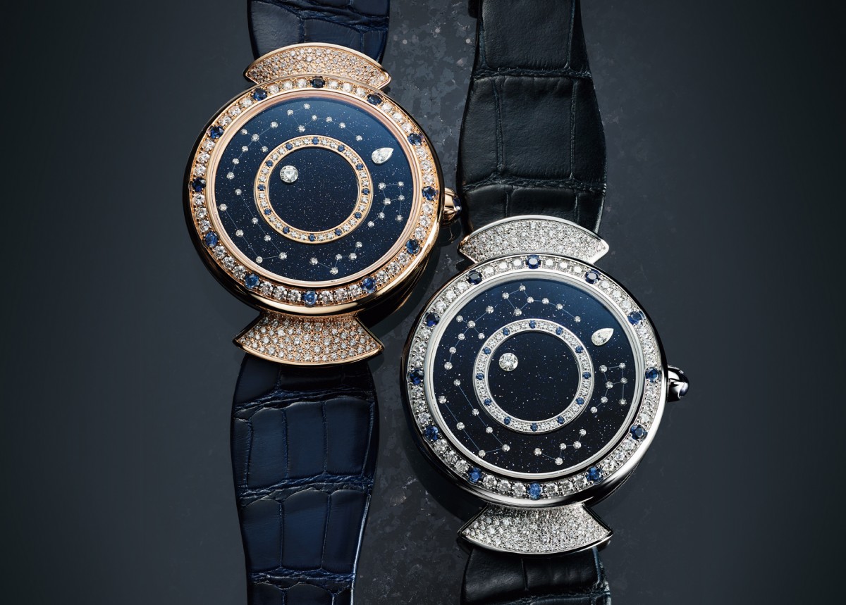 腕錶顯時借鏡行星環繞的行走軌跡,時標採用圓形切割美鑽,分鐘刻度為梨型切割鑽石,以圓形切割美鑽化作浩瀚星空中的星座圖示。寶格麗Divas' Dream系列可謂滿足女性對浪漫的渴望,以珍貴的彩寶搭配珠寶工藝敘述美學的故事,帶來Divas' Dream羅馬夜空星光神祕錶。腕錶以藍色砂金石面盤寓意星空,借鏡行星環繞的行走軌跡分別顯示時與分,還以圓形切割美鑽點綴浩瀚星空中的星座圖示,讓浩瀚星空盡收方寸之間。