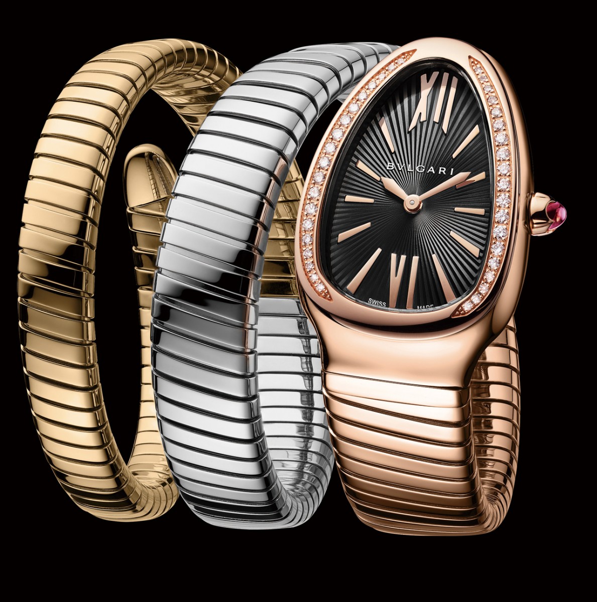 黃金、玫瑰金、白金3色K金組合材質/石英機芯/錶款鑲鑽/黑色蛋白石面盤/藍寶石水晶鏡面此外,2018年寶格麗還為Serpenti Tubogas腕錶帶來三款融合了經典K金色澤:白金、玫瑰金、黃金的鍊帶設計,為1960年代引進的三色款式帶來充滿現代感的變化。系列腕錶展示了寶格麗對於蛇形主題的狂熱,而Tubogas即為品牌經典之作。綜觀寶格麗女錶的發展,無論外型還是走時的精準度皆展現令人無法抵抗的美學魅力。