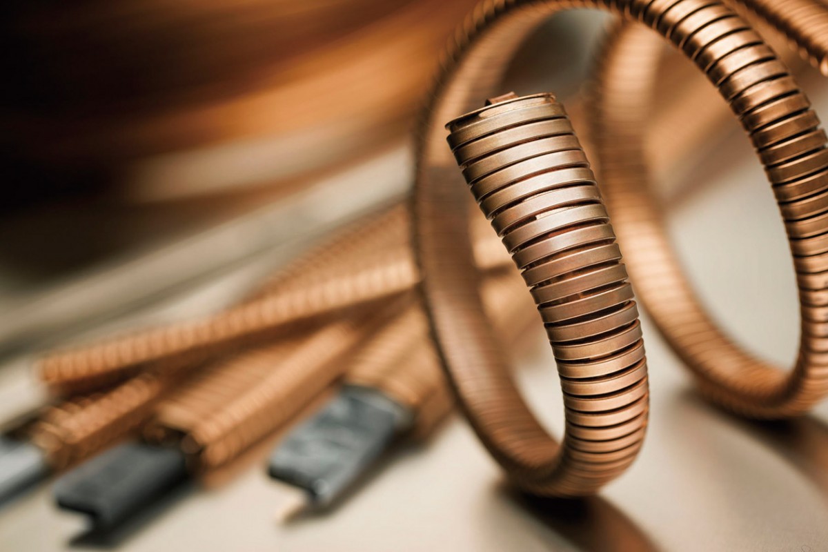 寶格麗腕錶鮮明符號——Tubogas鍊帶製程繁複,環帶的圓形輪廓緊密相扣,線圈的彈性正是Tubogas之所以栩栩如生的原因。