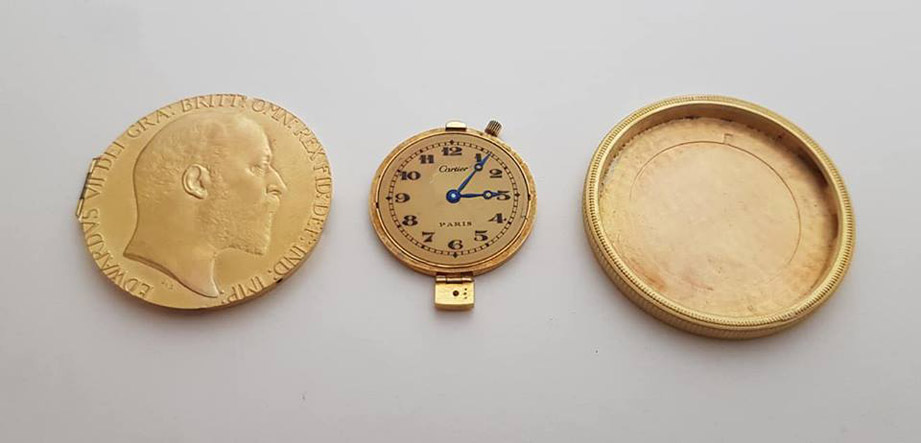 這只1930年代CARTIER金幣錶很罕見直接以整枚金幣挖空製作,與一般將金幣切開,正、反分別當面盤與後蓋,另外再以K金做錶殼的方式很不同。另外一提,它搭載超薄高級的手上鍊機芯,這機芯還有日內瓦印記,是一只值得收藏的好錶。