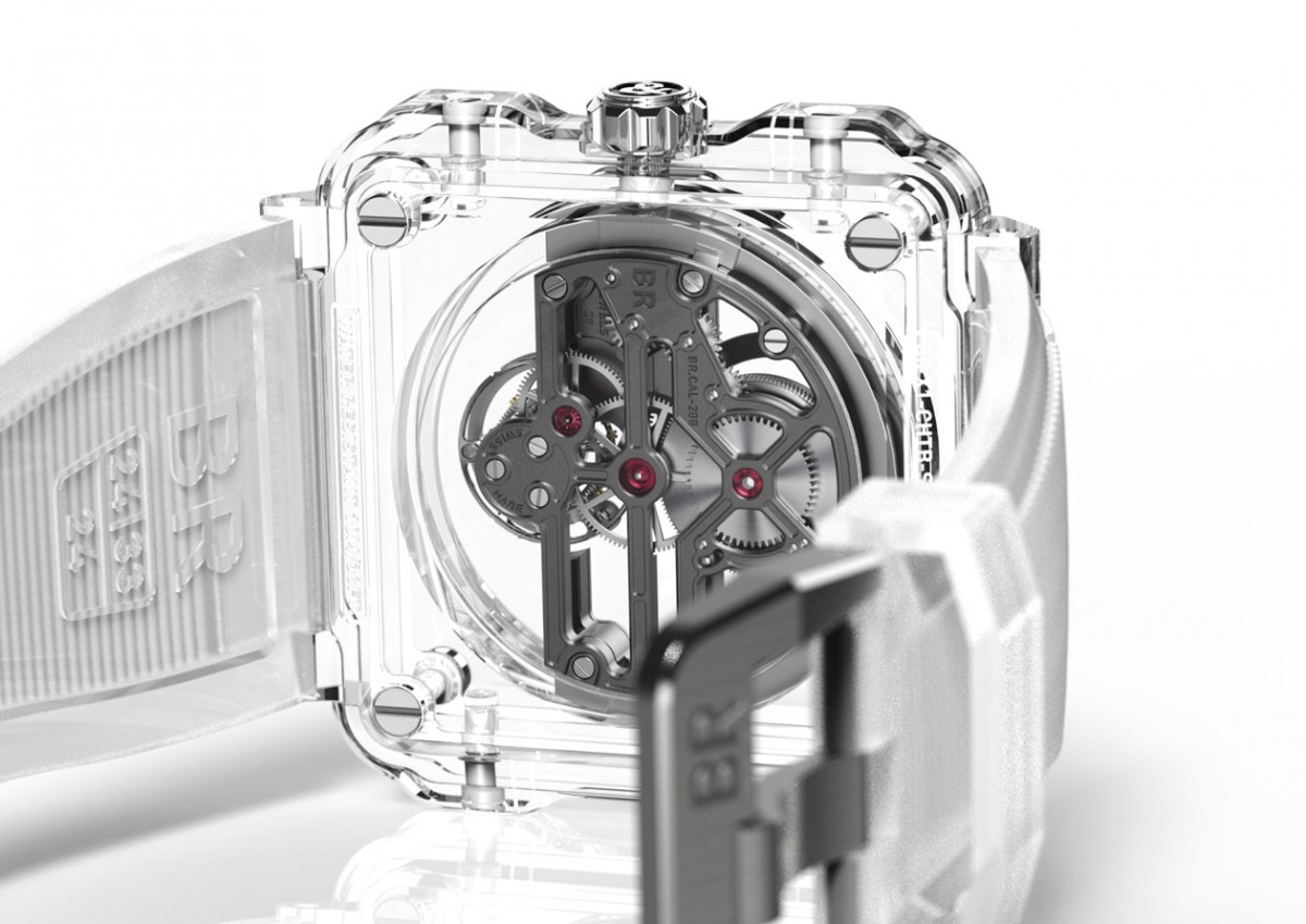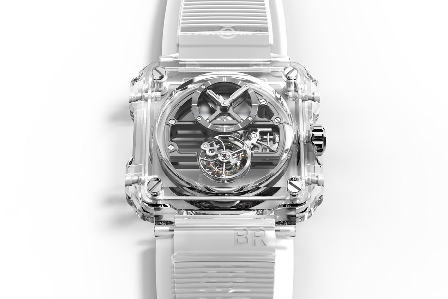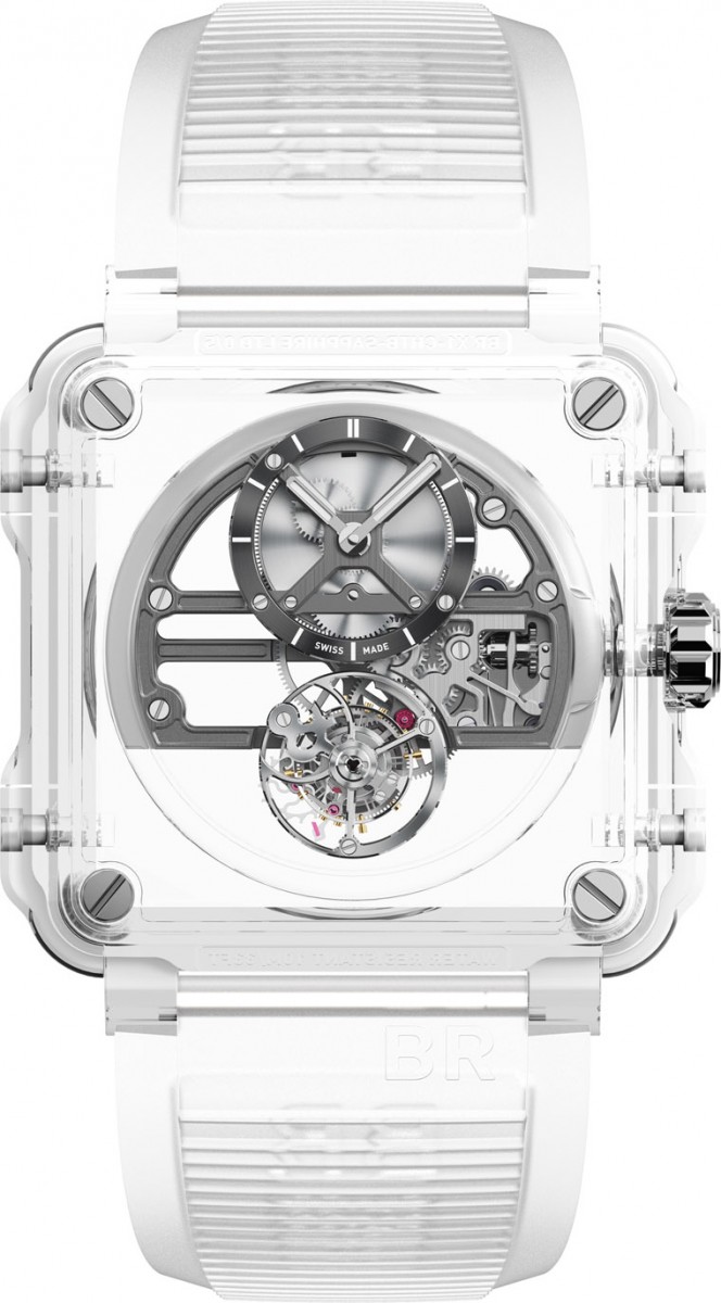 BR-X1 Skeleton Tourbillon Sapphire腕錶限量8只。錶殼由五塊藍寶石水晶玻璃組件構成;藍寶石水晶玻璃組件的切割及拋光打磨工序極之複雜耗時,最後以螺絲鑲密,造工一絲不苟,薈萃品牌的特色設計元素,製錶技術及美學價值更臻完美境界,巧妙揭開時間之奧祕。