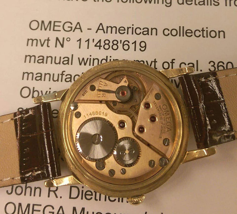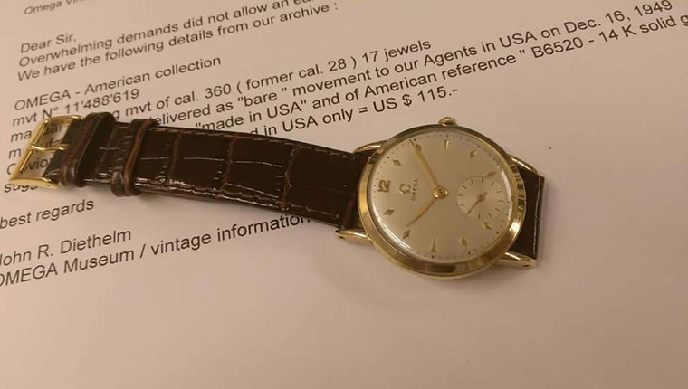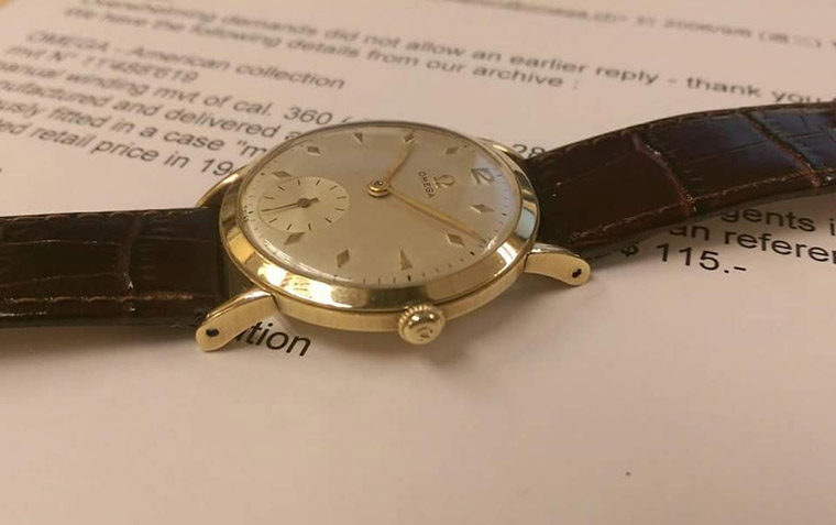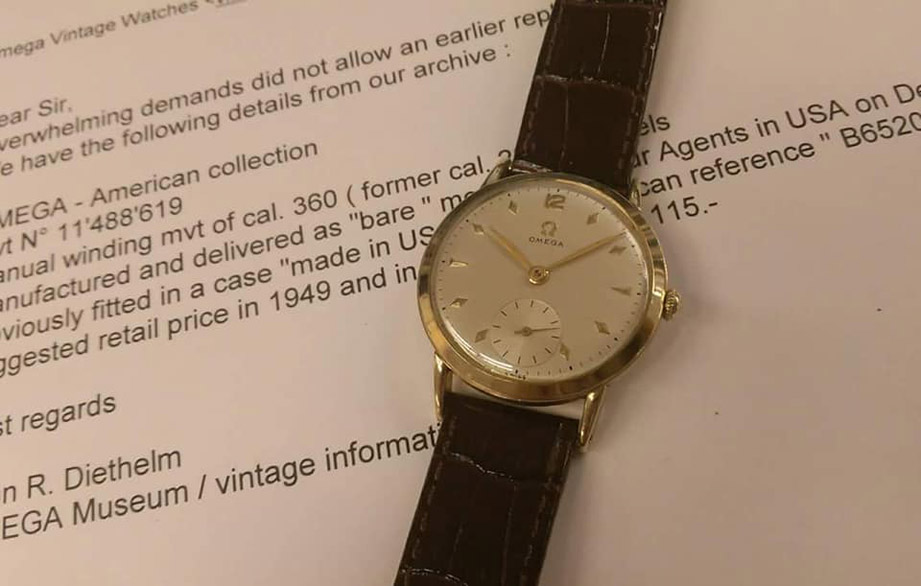 在一個偶然的機會裡我跟台灣網友要到一只OMEGA 14K金的手上鍊錶。我第一眼看到它時真覺得相當驚豔!因為查機芯流水號,這是一只約1949年生產的錶,但是狀態保存得非常良好,那時我覺得很不可思議,可能是我之前在台灣收了許多爛錶,遇到好的反而不知所措!