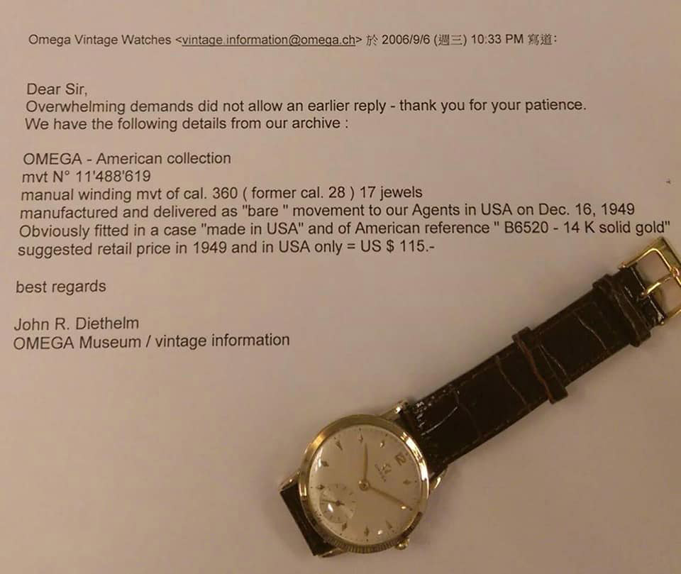 這是收藏道路上的一段美好風景。因為之後我食髓知味再e-mail給OMEGA博物館就沒有回應了。後來得知OMEGA博物館因為眾人的需求太過龐大,也因此取消了此種免費服務。但是現在還是可以跟OMEGA博物館申請文件記錄,只不過需要費用囉!(參考價錢是CHF120)